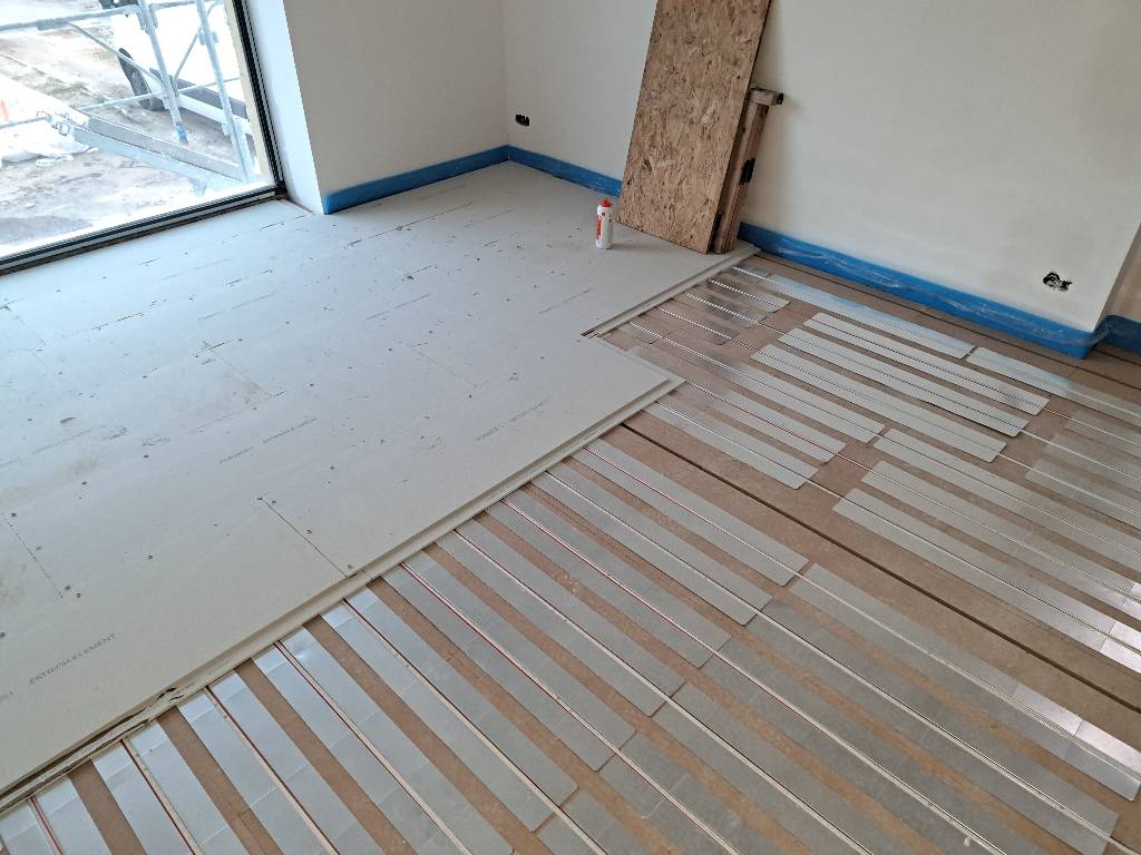 Rénovation globale d'une maison d'habitation, pour garder la hauteur sous plafond et il nous fallait réduire la hauteur du concept de plancher chauffant. Pour cela le plancher avec dalle sèche se trouve être la meilleur solution.